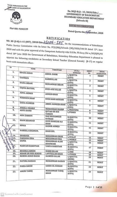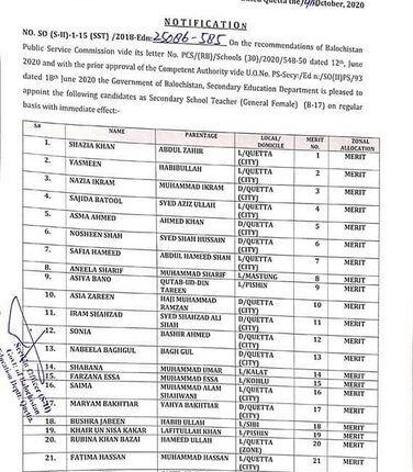 سرجم حوال نا رد اٹ محکمہ تعلیم بلوچستان نا کنڈ آن بلوچستان پبلک سروس کمیشن آن ایس ایس ٹی (جنرل) زالبول نا پوسٹ آتیٹی سرسہب مروک آتا تعیناتی نا نوٹیفکیشن جاری کننگانے۔
